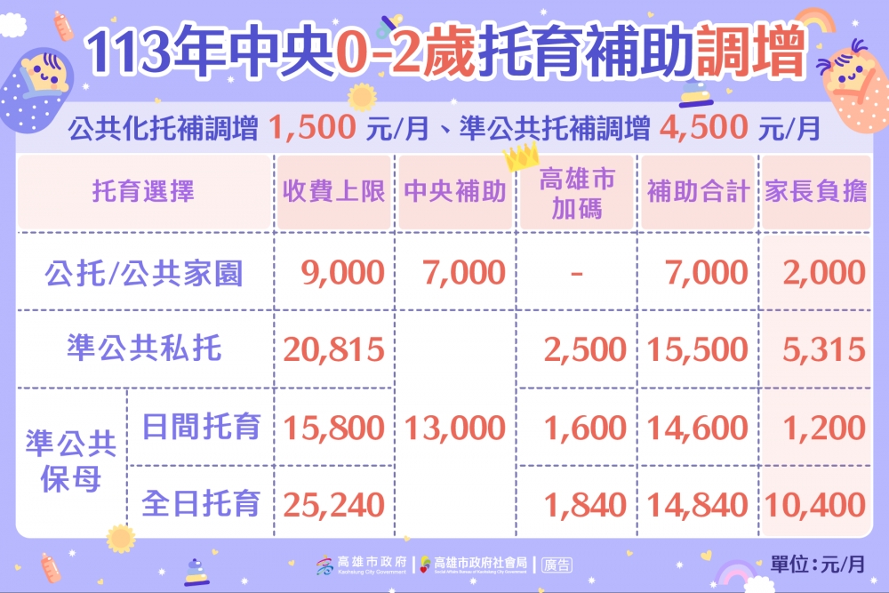 ▲ 托育補助:送托公共托嬰中心、公共托育家園、準公共托嬰中心、準公共保母,皆可請領。